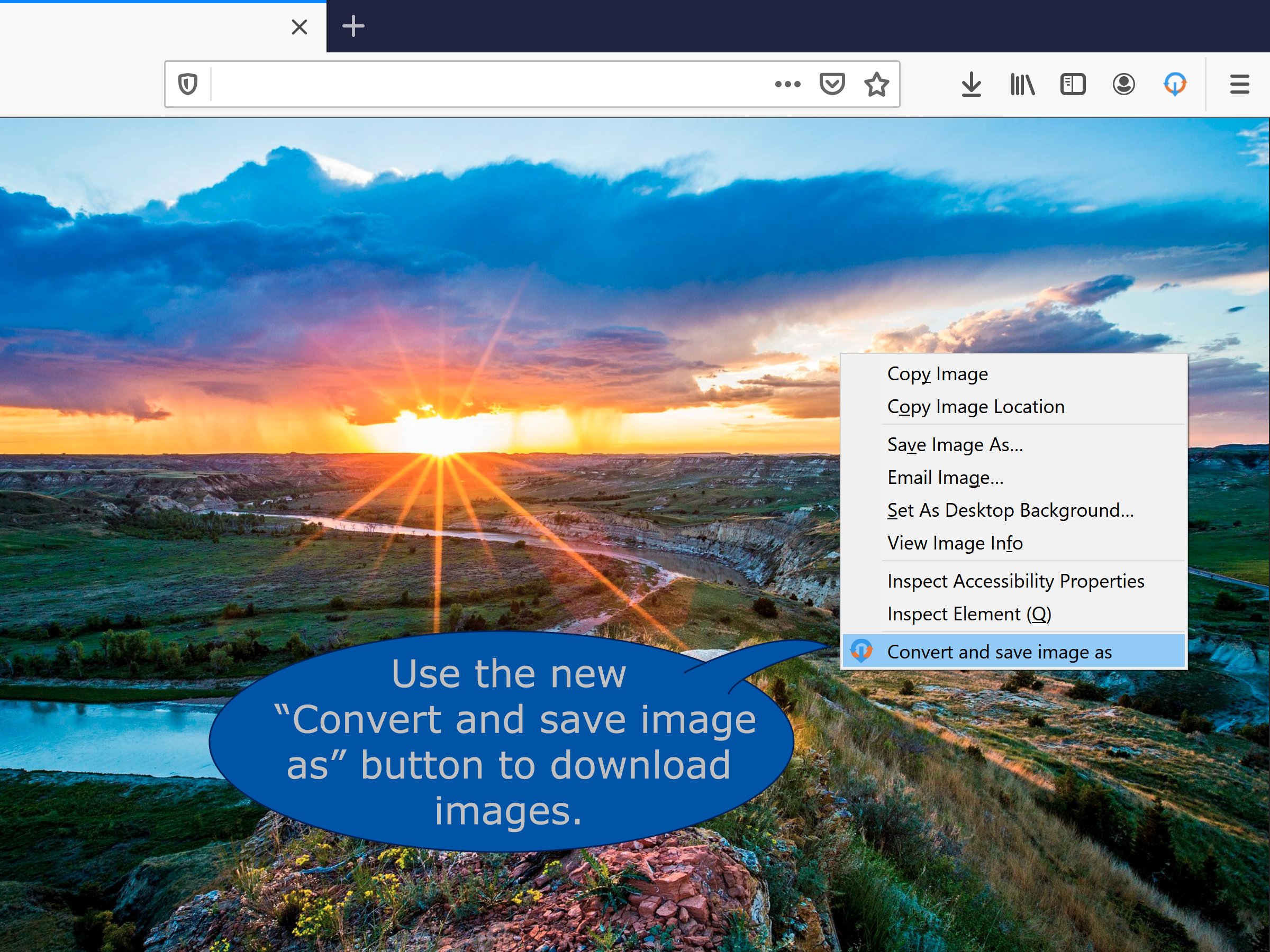 保存したい「AVIF」や「webP」の画像を右クリックすると、「convert and save image as」というメニューが追加されています。