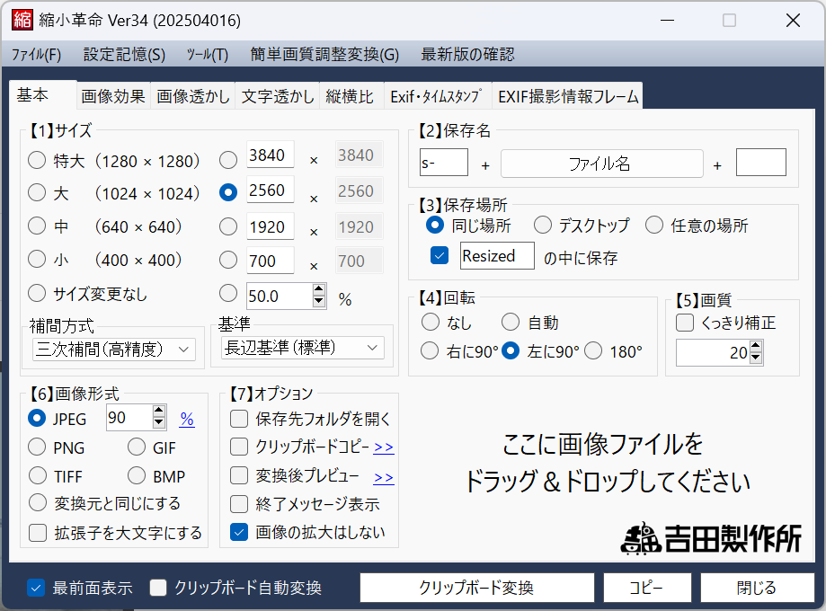使い方は「画像サイズ」を好みの大きさにして、「保存形式」を「jpeg」にします。